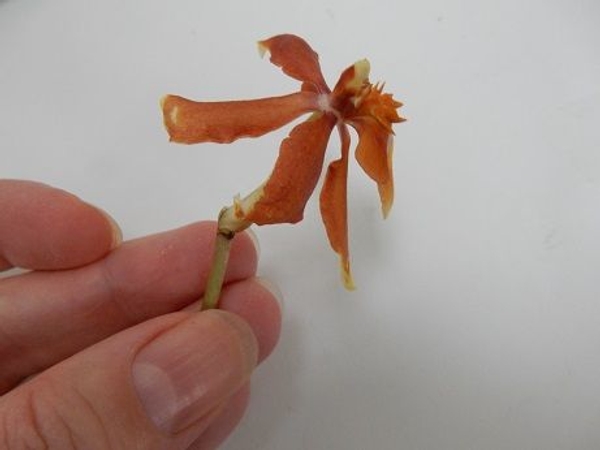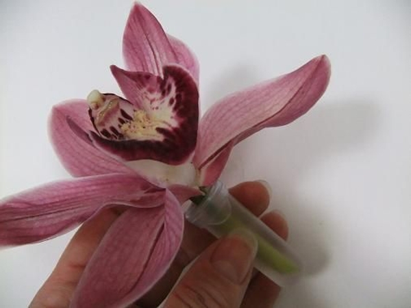 First remove the plastic lid from the test tube. Fit the lid over the Cymbidium orchid stem. This way it is easier to control how deep the orchid will be in the water and how high the lid will be on the stem. Measure the stem and cut to fit the test tube.