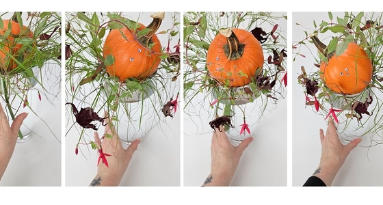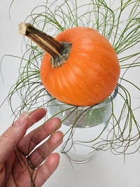 It’s as easy as… refraction. Above the vase we need the petal-less flower cluster to create the lightest possible fluffy cluster of grass like rays for our barely there pumpkin display but below in the vase we basically arrange light and water to create the illusion of a minimal base.