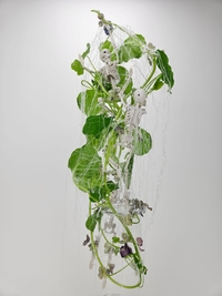Firstly when you tap the Styrofoam together once you get thick, sticky and strong strands of glue to spin your basic web, which is ideal for securing the design details in position. But then when you tap, tap, tap the Styrofoam multiple times you get more strands but they are thinner and light as air. Barely drape the thinner strands and give it a minute to allow the hot glue to cure from tacky to once again rubbery. Now you can go back and stretch the strands to accommodate the design details. Ideally you want a lace thin spider web covering on the foliage without it looking curled or folded. I use a bamboo skewer to release and tease out the leaves. Simply give the glue strand bundle a lift away from the foliage so that you can feel it stretching giving the leaf more space to grow. When you release it again it settles around the leaf without actually pulling on the leaf. Growing cut nasturtiums gives you an everchanging design that will never look exactly like the last time you saw it… so perfect for Halloween!