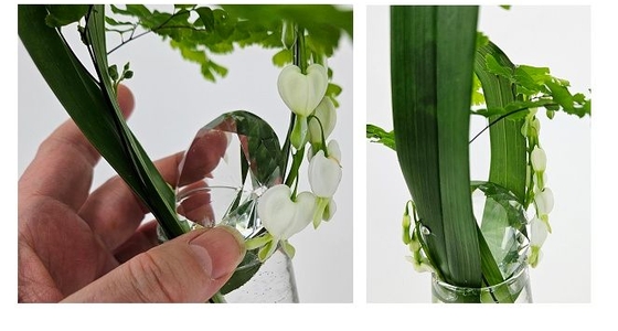 Anyway… my design note for you this week is a personal preference but still well worth noting. I like to always position my design elements so that they look like they are having a cozy conversation. In this design it meant taming the bleeding hearts just a bit so that they turn into the cymbidium foliage loop to look through the loop, at each other. A bit like neighbours having a cozy chat over the garden fence.