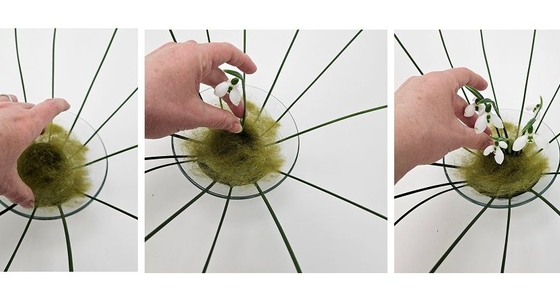 There are many ways to use a Kenzan to keep even the thinnest stems upright in the metal teeth. Most of the time we clump the thinnest stems together and pierce the clump to make sure it remains upright. But I find creating a thin blanket of wool, draped over the teeth creates just enough padding for even the thinnest stems to easily wedge between the teeth and to remain perfectly upright.