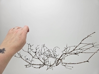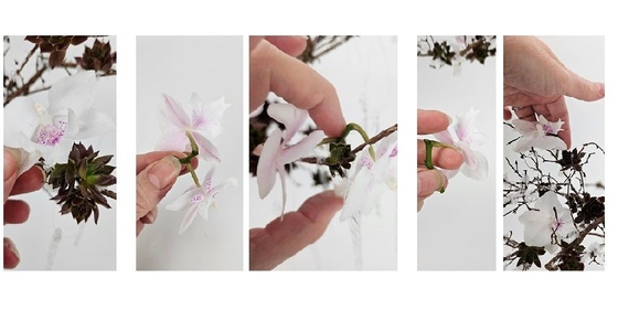 But my main reason for first hanging the swag is because I want to see exactly how I can position the orchids before cutting any flowers from the stem. Yes, you can simply cut the flowers from the stem in one way but what makes Phalaenopsis orchids especially ideal for a design like this is how the flowers grow on the tall and elegant spikes. The stem and flower position depends on where you cut it giving you multiple design (see the pictures above) options. This way you can envision how you want the stem to be positioned, cut the flower and slip it between the twigs exactly how you want it.