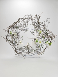 For this design I used a paper star shape as a guide. But instead of merely drawing the shape and using that as a template I made the star from strips of cardboard paper. This way I can pick up the star by the robust paper guide as I build up the twig shape to turn and fit it and measure it over my glass container. Every now and again check to see where to position the more robust twigs that will be glued to suspend the armature on the glass container. But pick it up by the cardboard not the twigs. And remember those twigs that will carry the weight needs to be secured in three places to other twigs when building the armature. Make sure the twigs are glued to other twigs and not to the cardboard and not to the glass container. This way you get a really secure armature that can be handled without it falling apart. Only once the armature is secure should you lift it up, position it on the glass container and secure it in place.