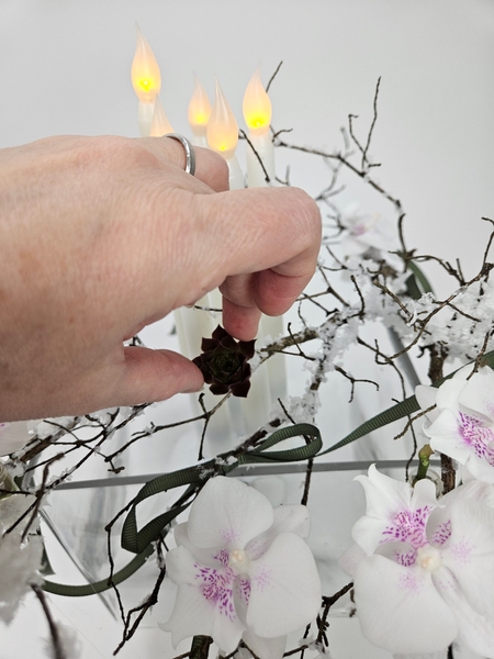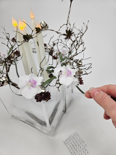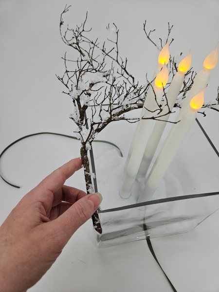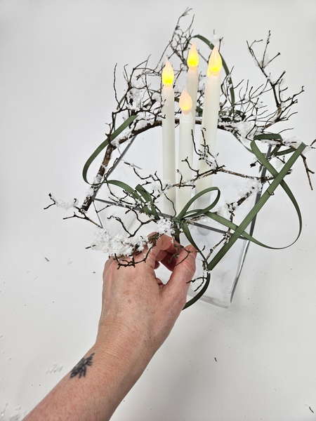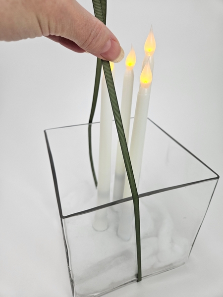 If you are displaying the design and want to switch the candles on and off secure the candle holders to the bottom of the vase with floral putty. Use the technique that you use to secure a Kenzan.