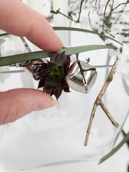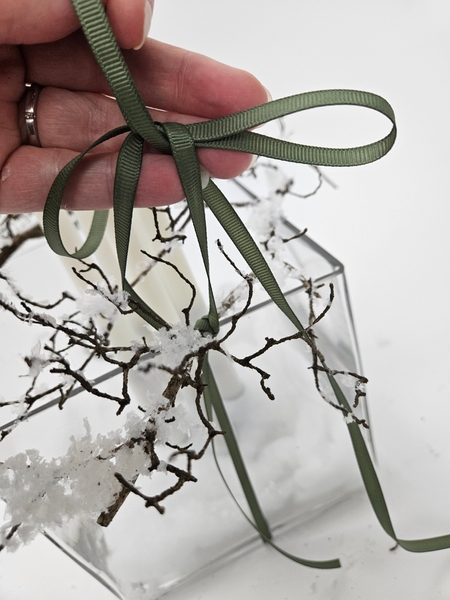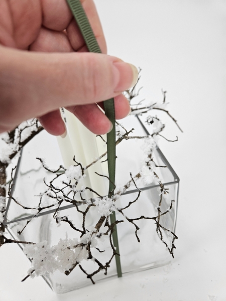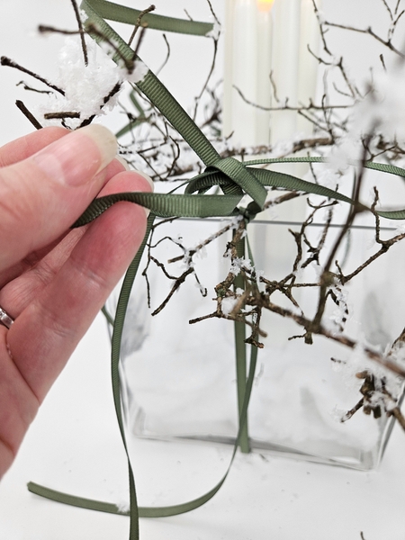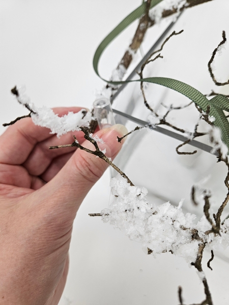 This entire design is all about not breaking the delicate twigs! Even the snow is actually to make the dried twigs a little more robust. Be careful, especially when adding the ribbon. If it snags the twigs will break.