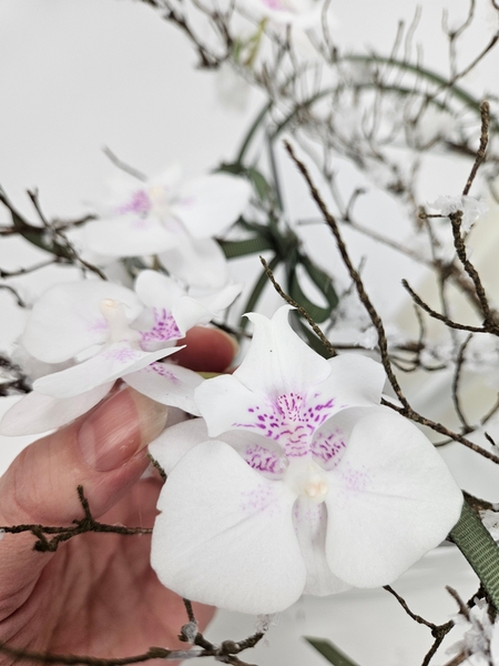 Slip the orchids into the water filled tubes. Make sure not to touch those delicate twigs.