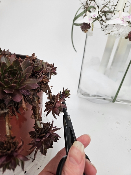 Book readers turn to page 105 of my book where I show you in detail how to groom succulents so that you can glue them into a design. This is a great way to allow the succulents to callus over if you want to propagate your overgrown plant.