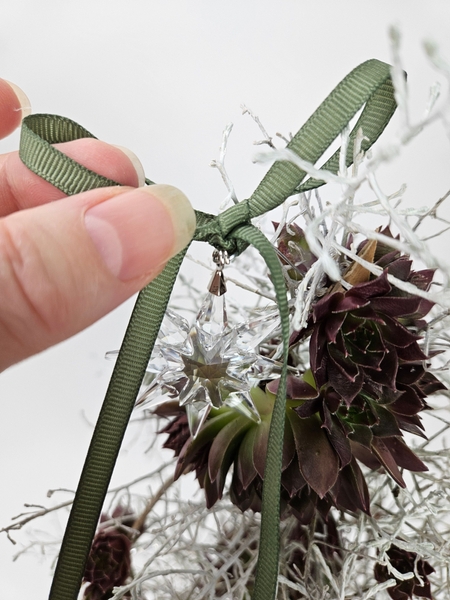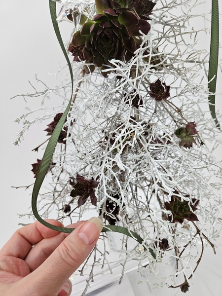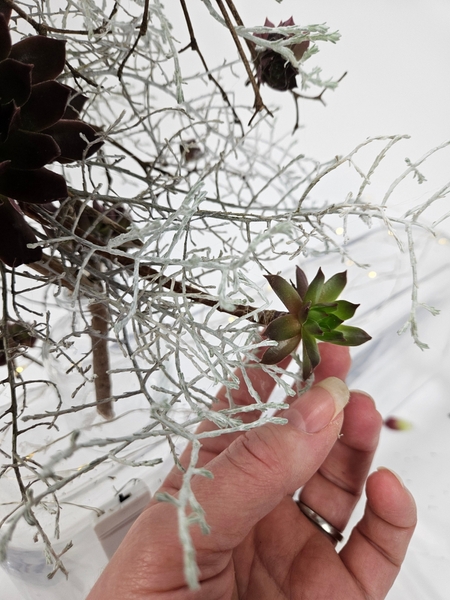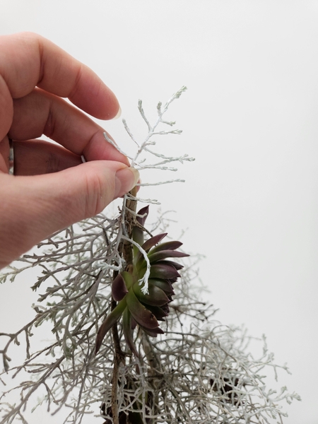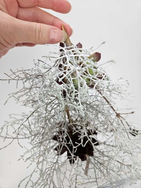 Follow the Christmas tree shape using the twig as a guide. Make sure to conceal the cut ends of the larger succulents with delicate silver bush branches.