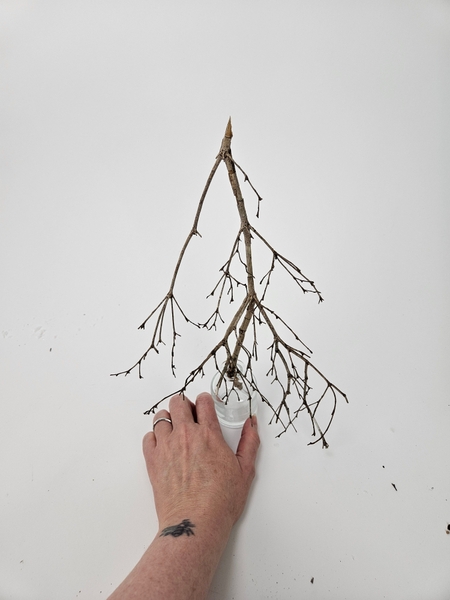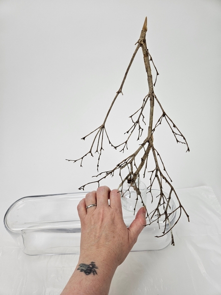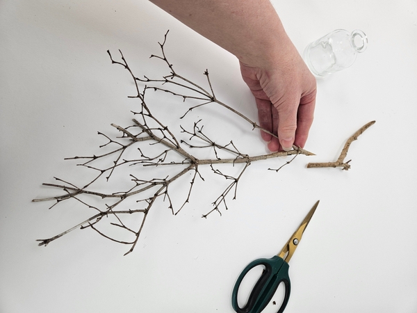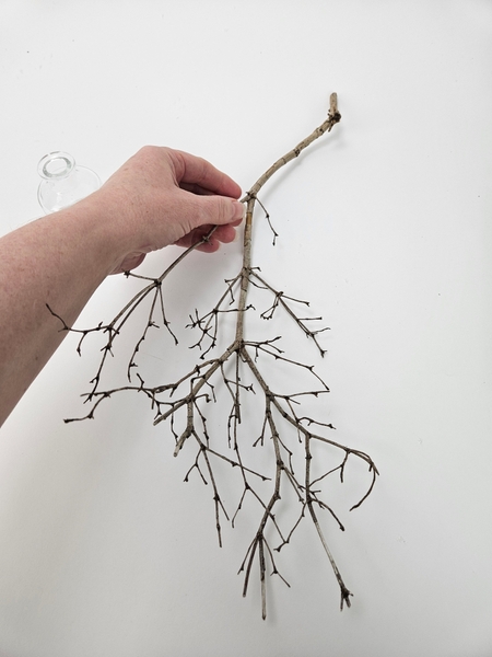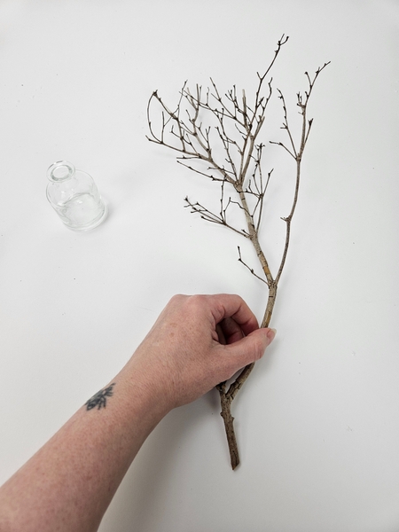 Trim away the side branched at the thinner tip end of the dried branch so that it fits neatly into a bud vase.