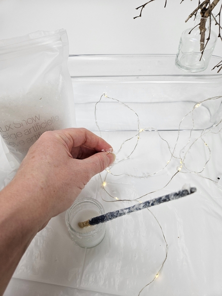 ... because I want my winter white design to stand in twinkling snow. Simply paint the wire on a fairy light with wood glue and sprinkle on artificial snow. You can follow the exact same technique that I showed for how to add snow onto twigs. See the Tutorial below.
