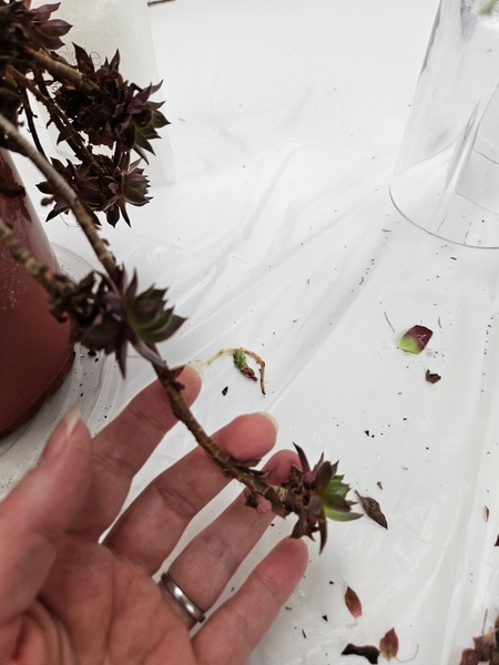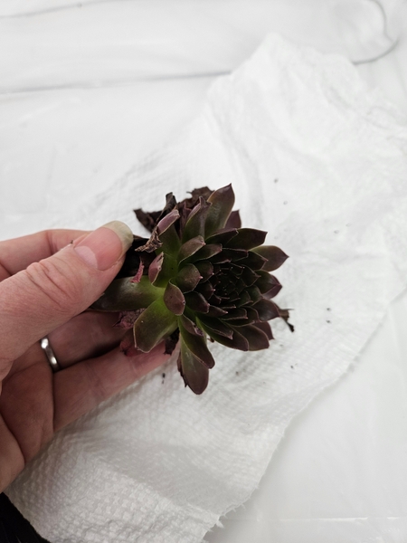 Snip a few Sempervivum 'Chick Charms Chocolate Kiss' succulents from a plant and groom them so that you can glue it into the design.