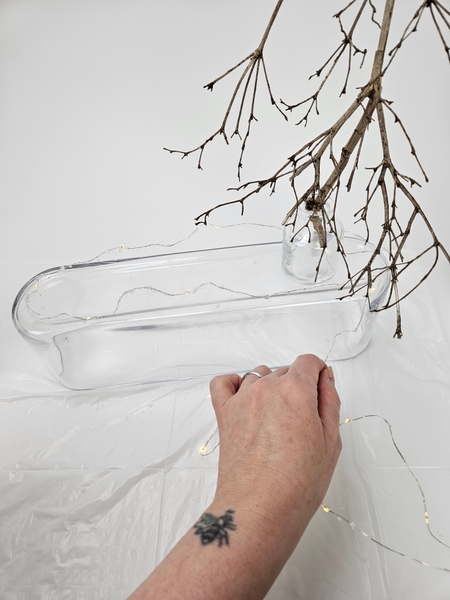 Clean up the display surface below the Christmas tree with a brush and make sure the lights are still secured where you want them...