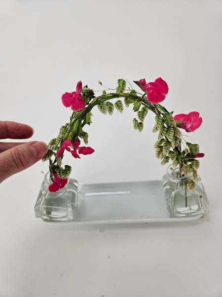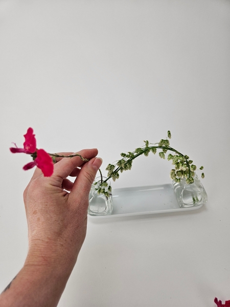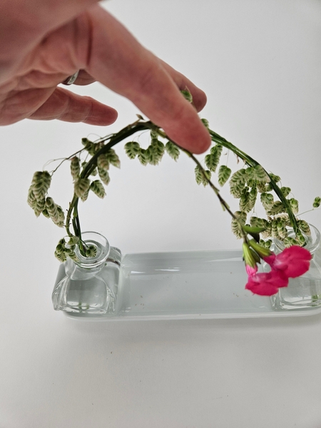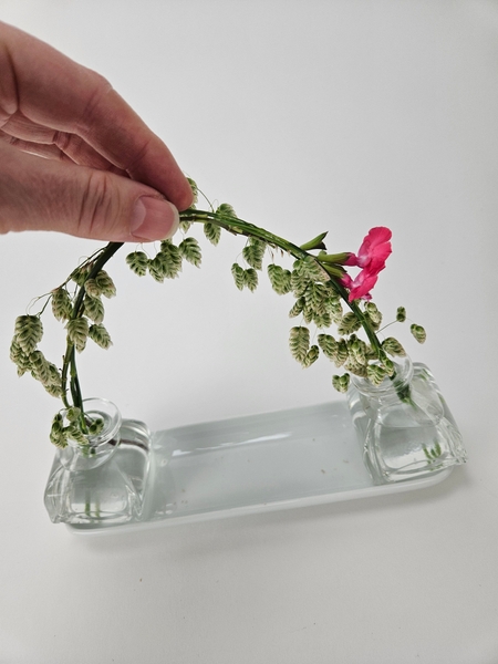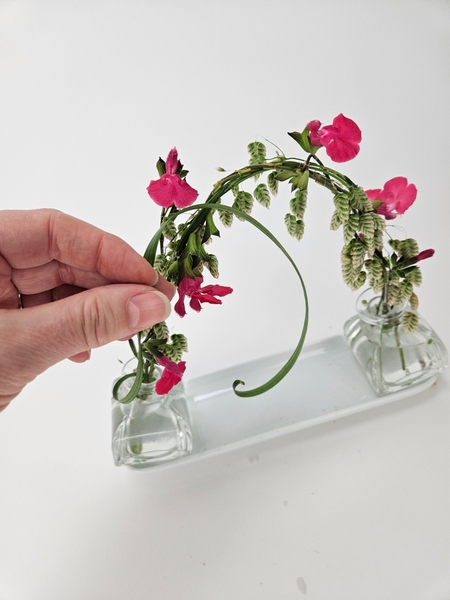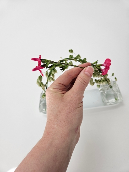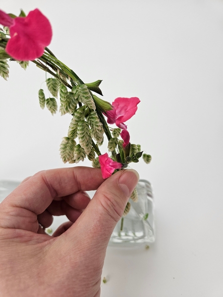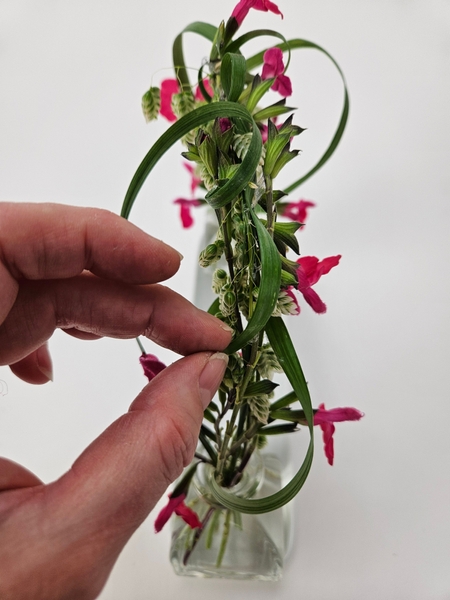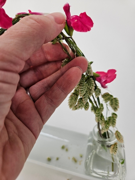 Slip the unopened flower buds through the stem to neatly anchor the flower stems into the grass seed head curve.
