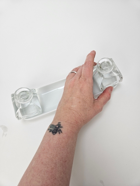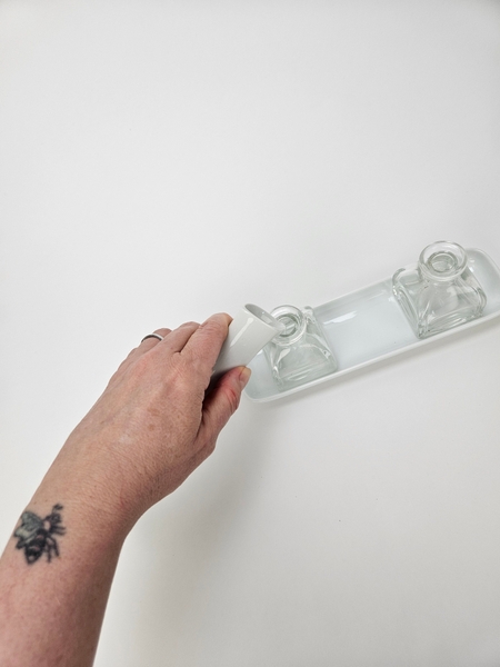 Add just enough water so that it will not spill out when you place the vases on the edge of the tray to stand up at an angle.