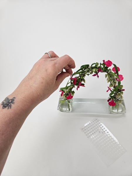 Add in flowers from both ends so that they cross to look like a vine twirling over the grassy curve.