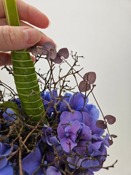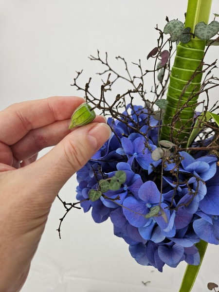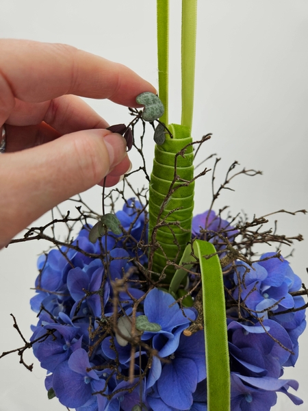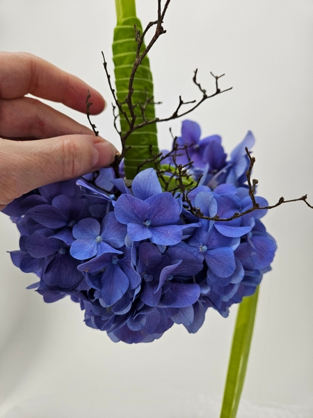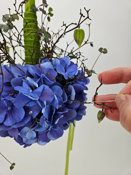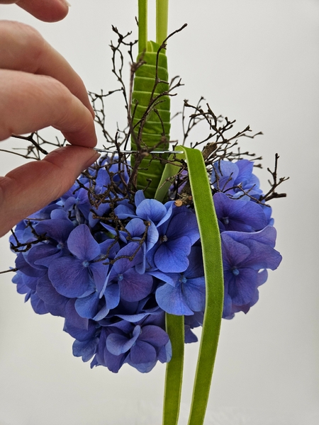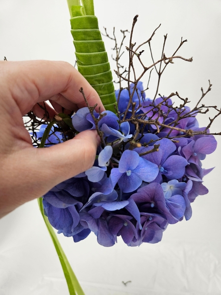 Reach deep into the hydrangea to lift out the hydrangea florets so that they are supported by the twigs around the ball shape. Hook the stems of the corymb or cluster to hook over the dried twigs. Make sure not to bruise the petals, though.