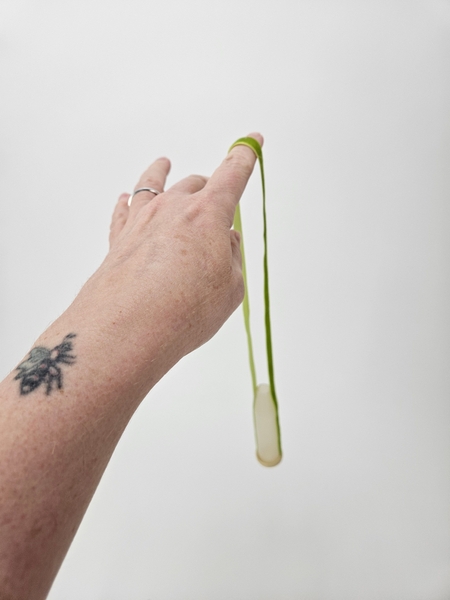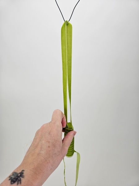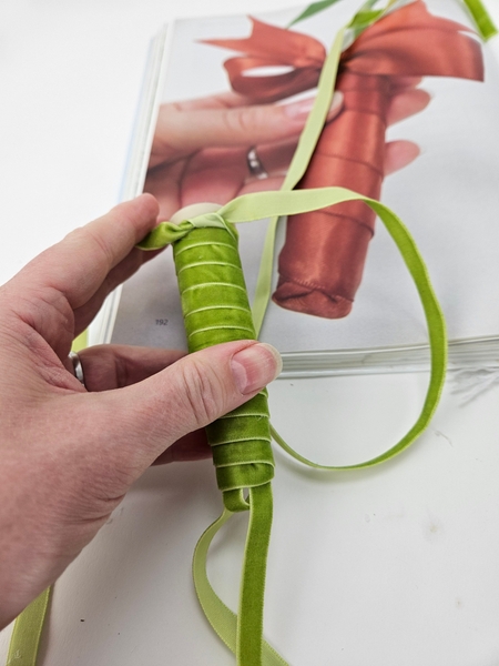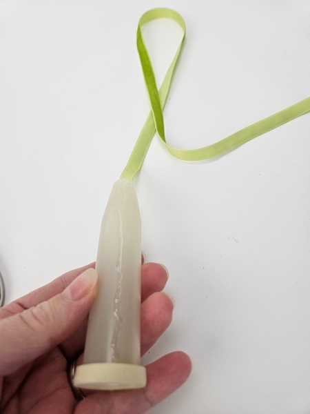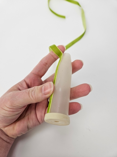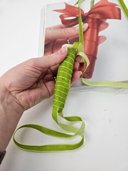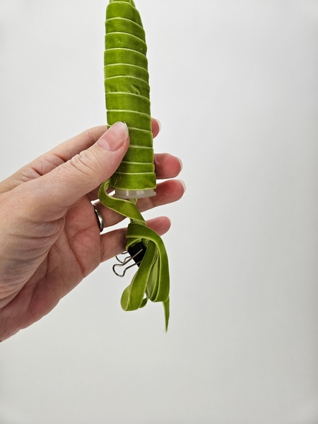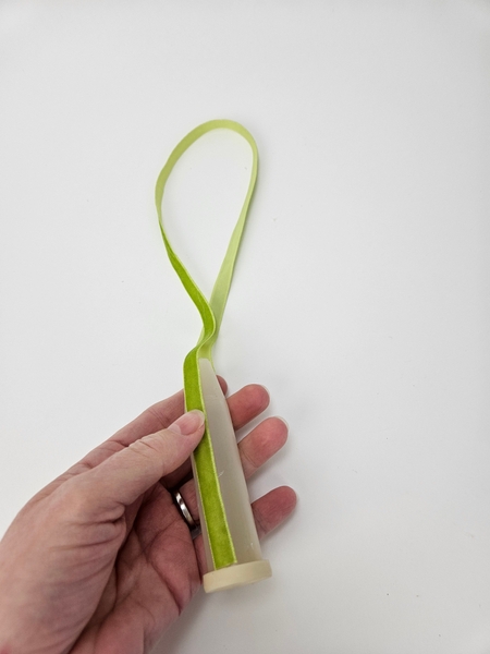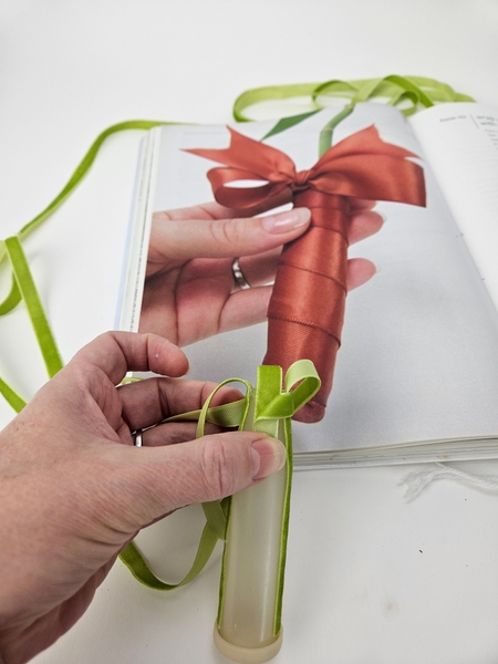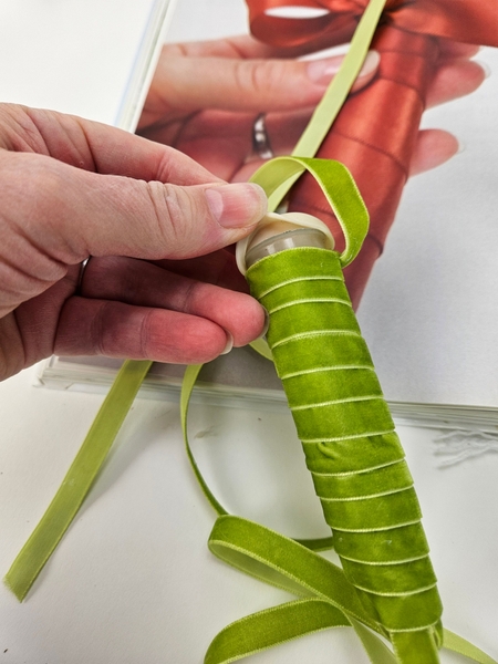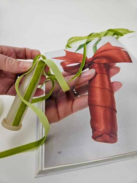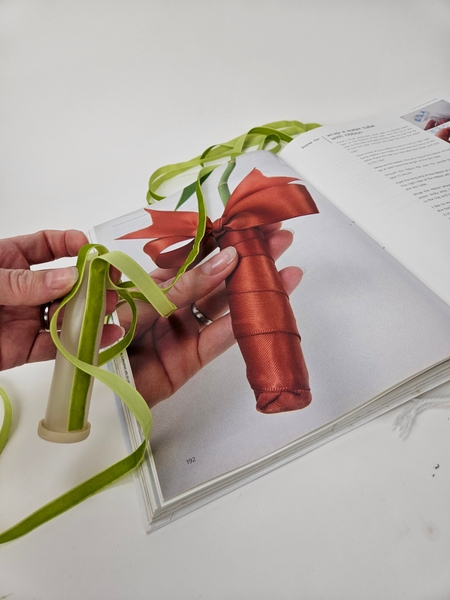 I am basing the design on the How To you will find on page 192 of my book. This one is for wrapping water tubes with ribbon, for general use. To tweak it slightly for upside down designs you will notice that instead of the ribbon hugging the end neatly to cover I am leaving a loop so the you can fill the water tube with water when it hangs.