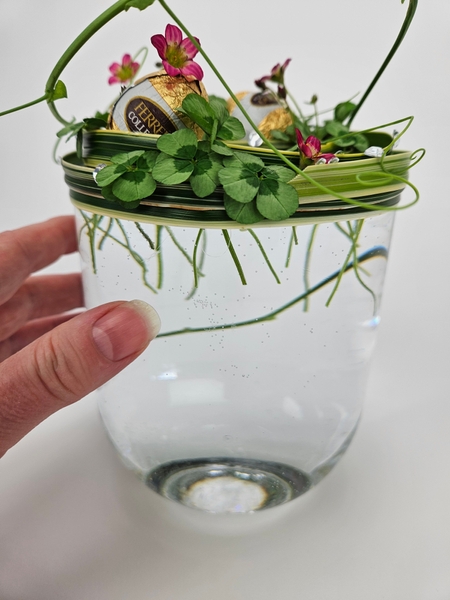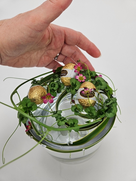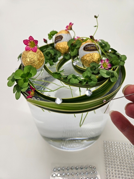 And take a deep breath... the next part is a bit tricky. And! It can spoil the entire design if the vine disturbs the delicate flowers. Feed the stem into the container through the armature.