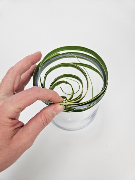 Wrap the grass tightly all the way around the opening of the vase and secure it with floral glue.