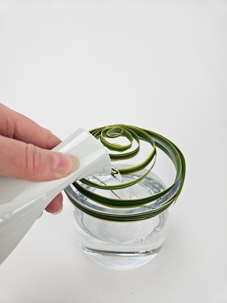 Add the delicate Saxifraga flowers using the spiral as support to suspend the blooms above with the stems hydrated in the water below.