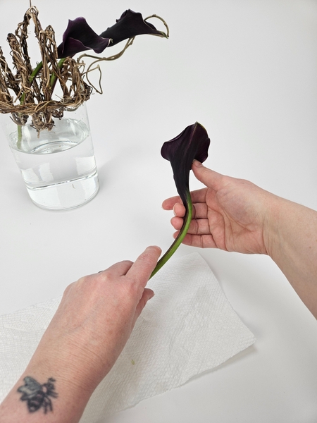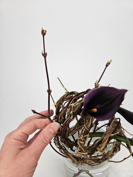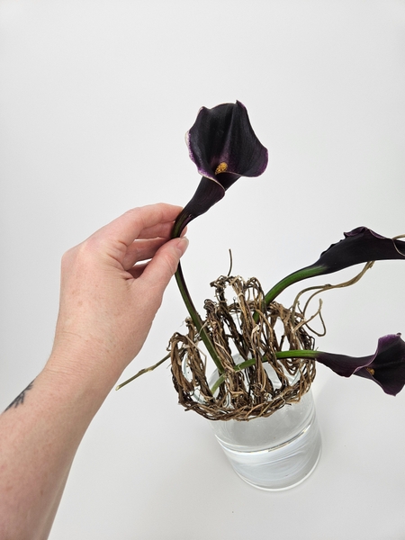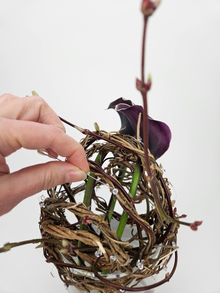 Gently message deep burgundy arum lilies to curve them so that they drape over the twig sphere.