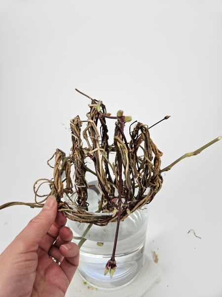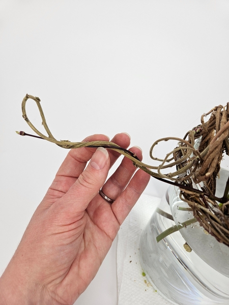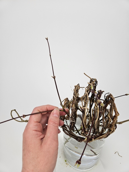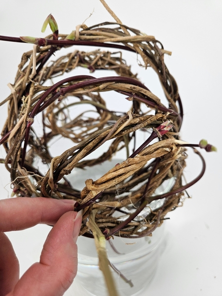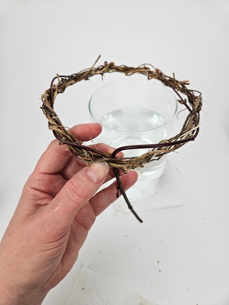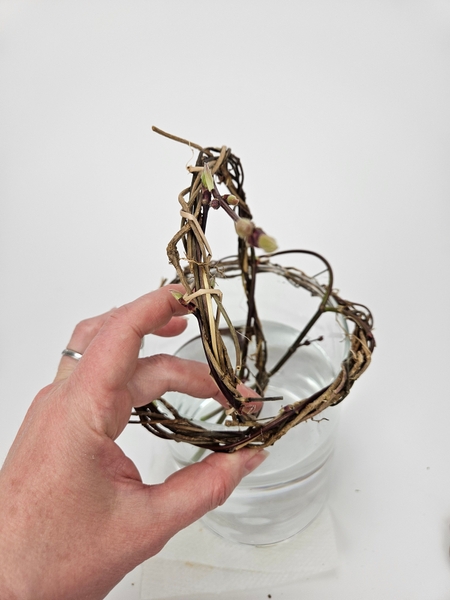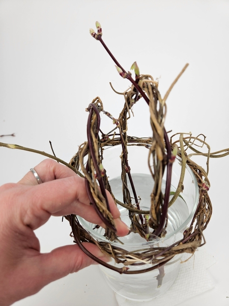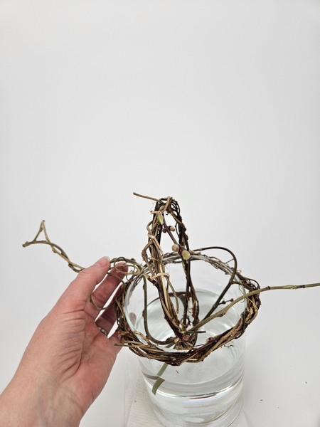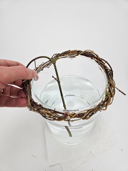Wedge the wreath into the opening of the container and set the cut ends of the twigs into the water.
