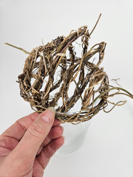 Slip a twig or tendril through the wreath to rest horizontally over the opening of the container.