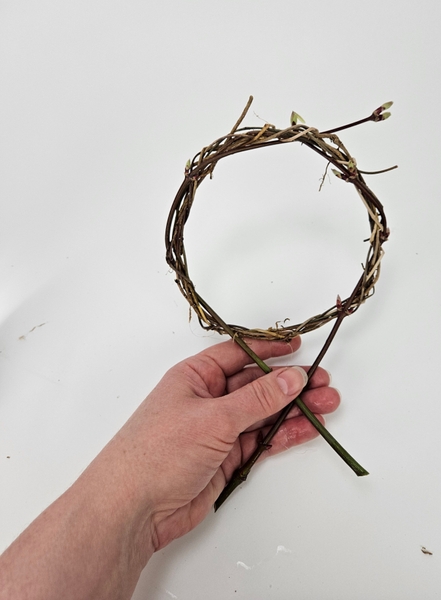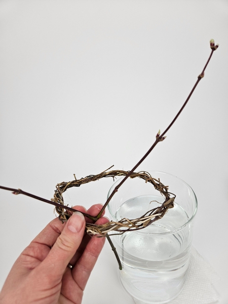 Weave the fresh twig into the wreath and make sure the cut end of the stem extends so that you can place it in the water in the display container.
