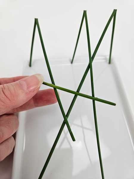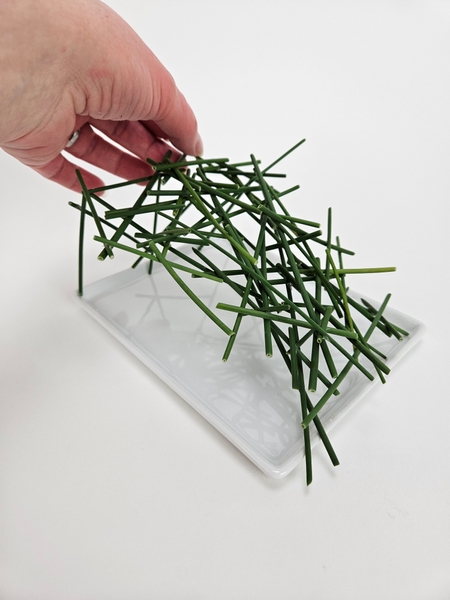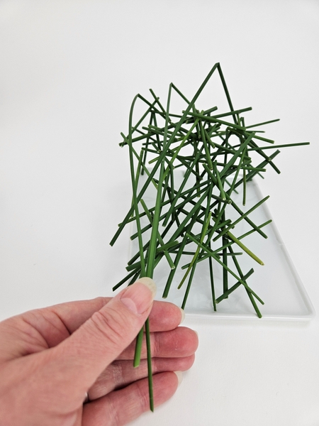 The trick is to craft an armature with the least possible amount of grass snippets (so that it still looks stacked but not "solid") but at the same time be robust enough to carry the weight of your other plant material. Make sure to glue the grasses to connect each grass snippet at three places.