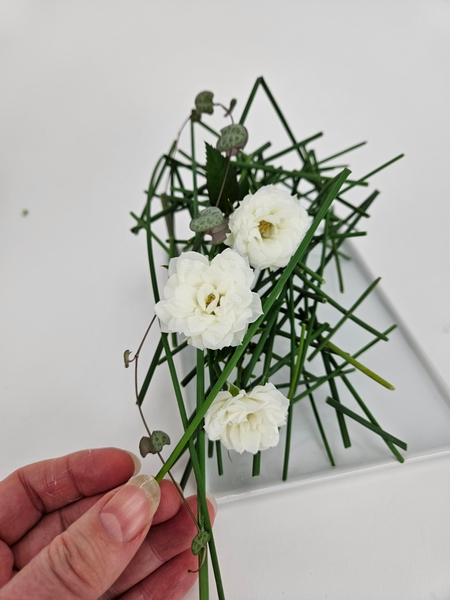 The tube support gives the rosary vine just enough lift at the back so that it can drape over the roses down the front of the design.