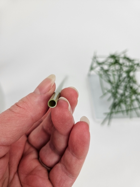 But for my design I am also adding tiny tubes as a water source for the roses and to give the stems the support they need to be placed at a similar angle into the grass snippet armature. See the Tutorial below for detailed instructions on how I make water tubes from drinking straws (and tubes).