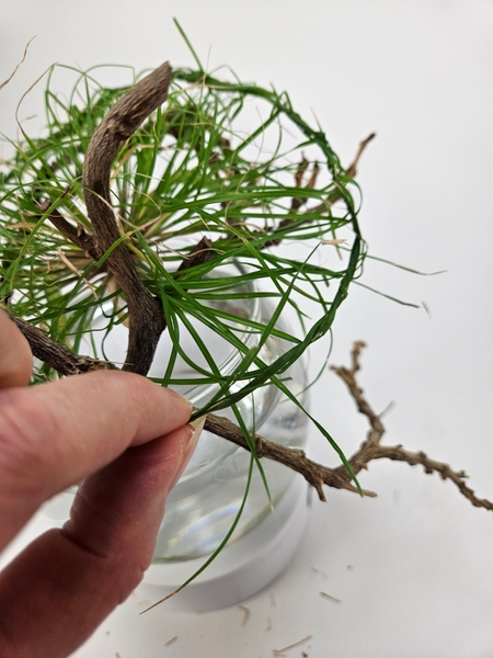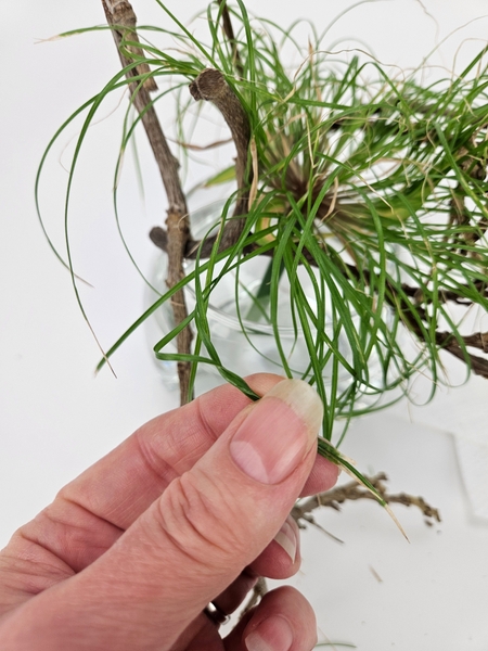 Design note: For these grass lines (I am adding 3) I wanted to use the same grass as what I used to weave the bird. Only they were too heavy so I ripped them with a pin. See the Tutorial below for detailed instructions on how to rip foliage.