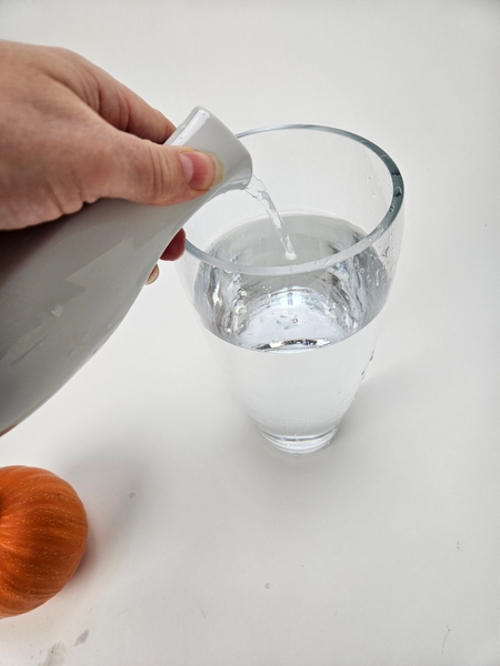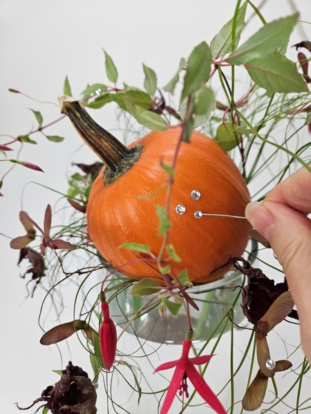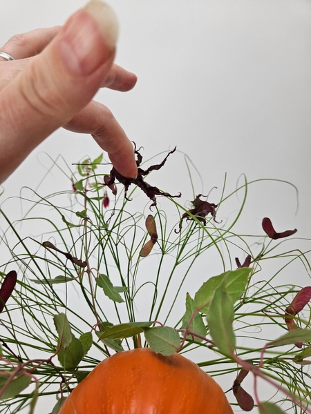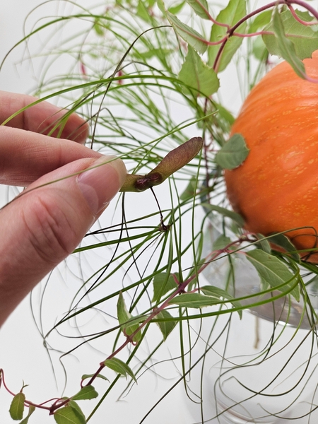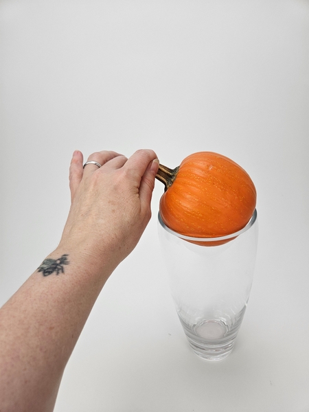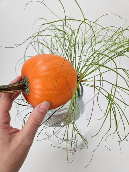 Match a small pumpkin so that it rests comfortable in the opening of a clear vase. Turn it slightly at a casual angle so that it sits in the vase but is not wedged into the vase. It really is important that the entire design remains light and airy. Nothing gets wedged into position.
