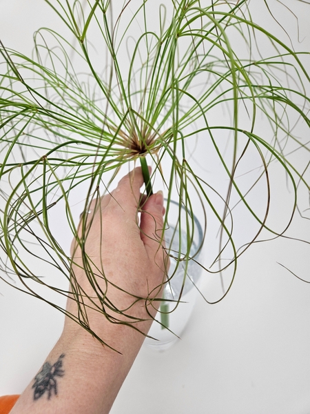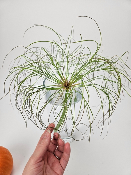 The papyrus culm should rest comfortable to prevent the papyrus from slipping into the vase when you add the pumpkin.