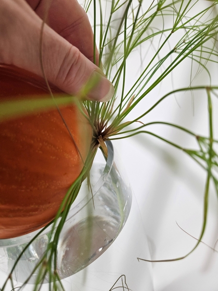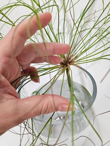 Thread the stem into the container at that exact place to make use of the natural droop to add lightness to the design. The idea is that the flower stem should have an uptilt so that it looks light and airy in the display.