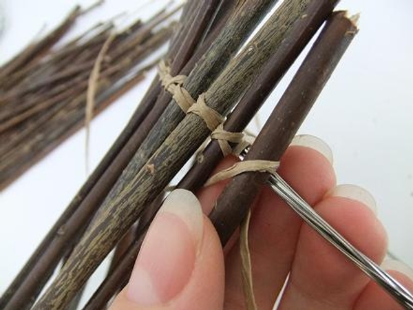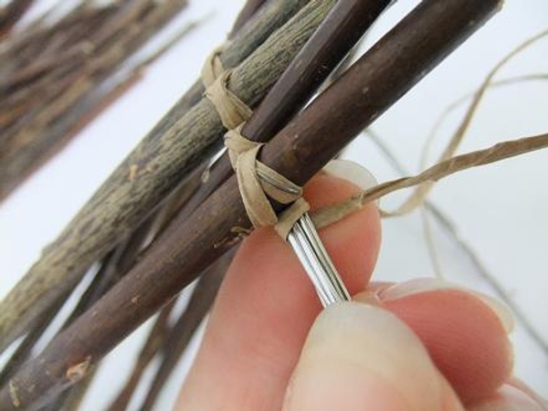 Bind the twig to the circle with bind wire. Cross the wire over to the back.
