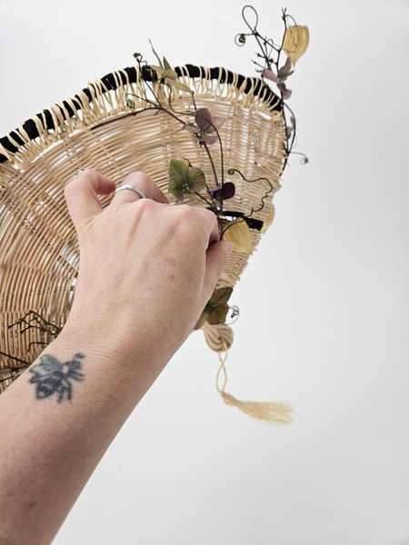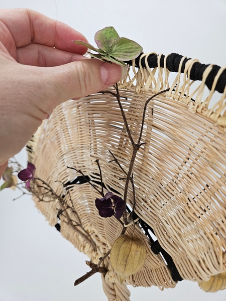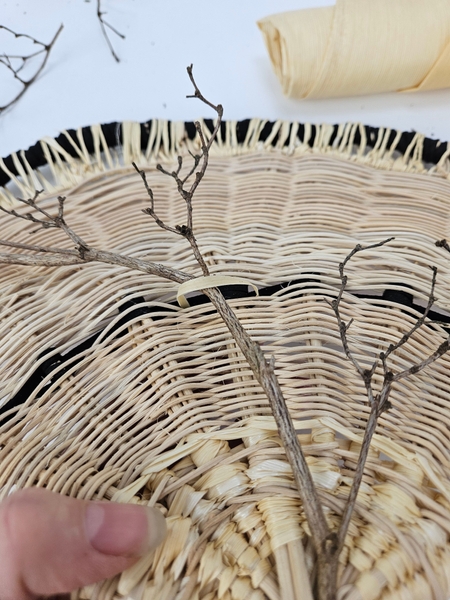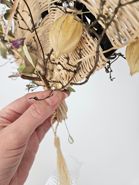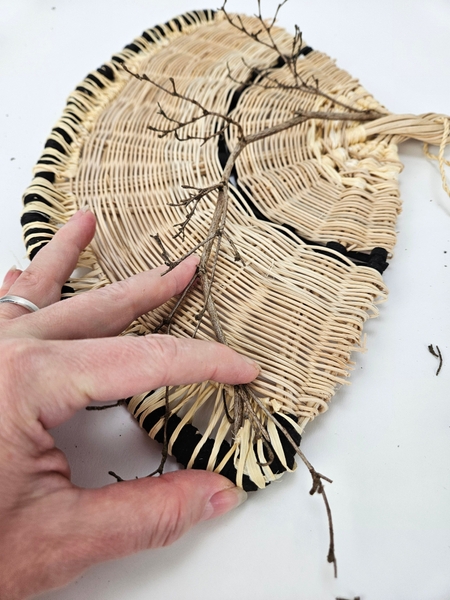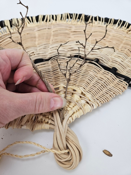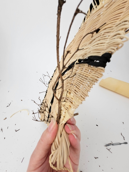 Add in a few dried twigs by cutting the end to a sharp point and pressing the stem into the rattan.
