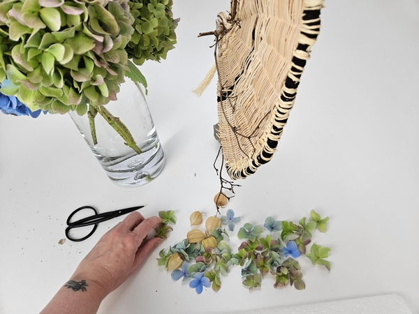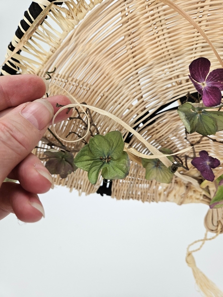 Now that we have our hydrangeas ready... let's weave our fan. For my fan frame I am using both thin and thicker rattan.
