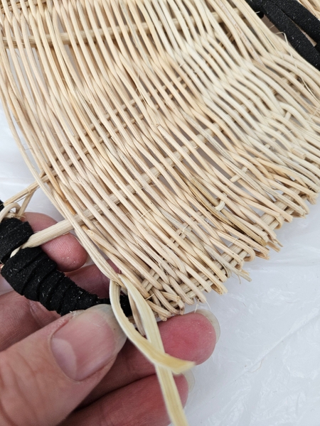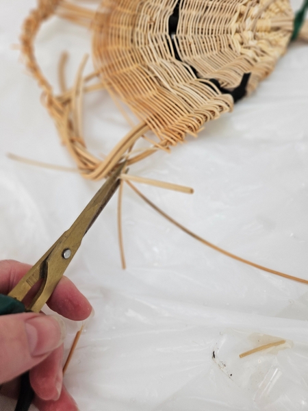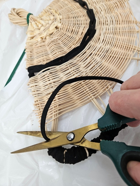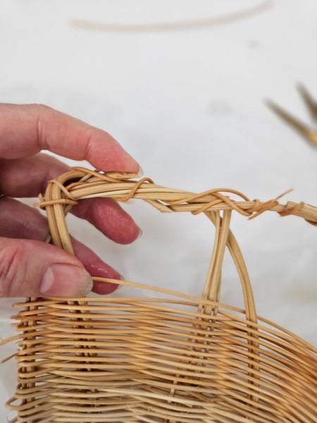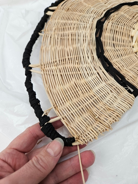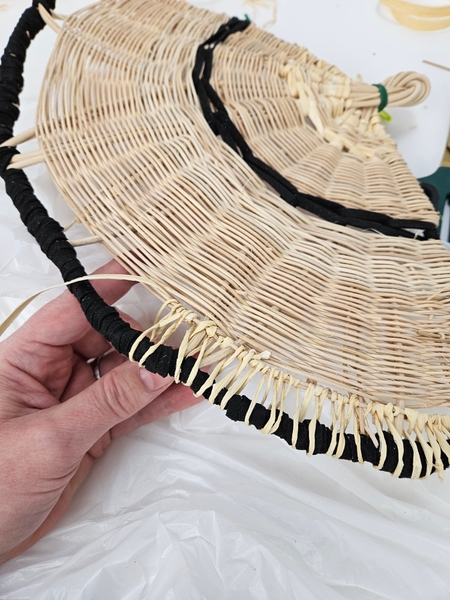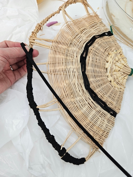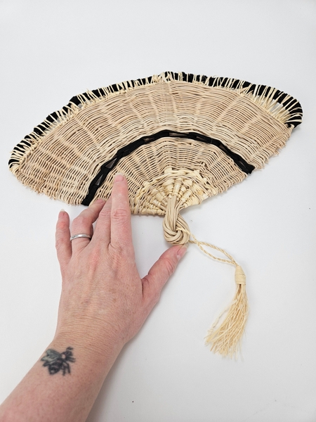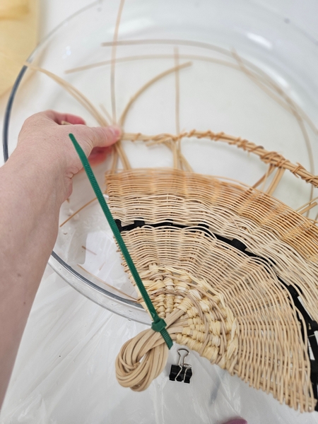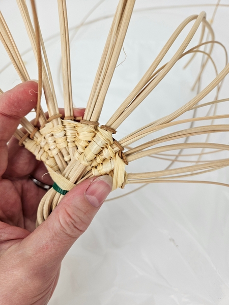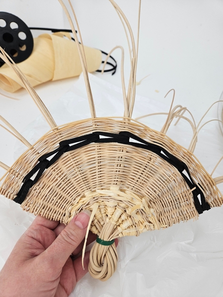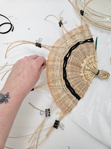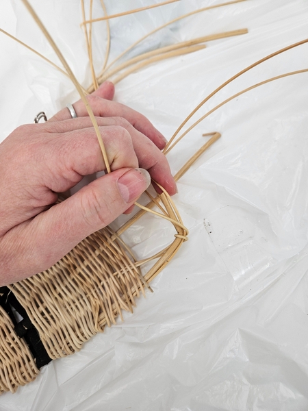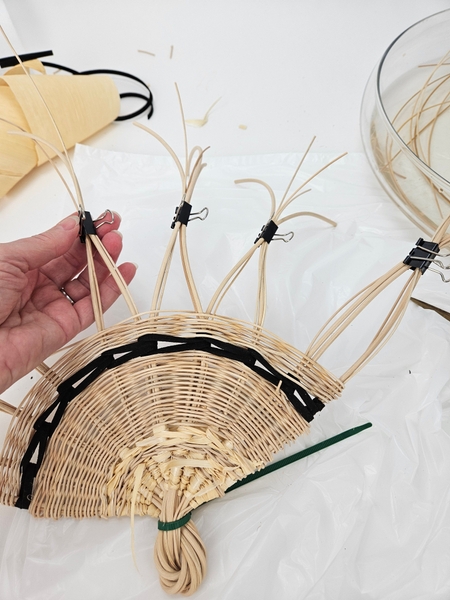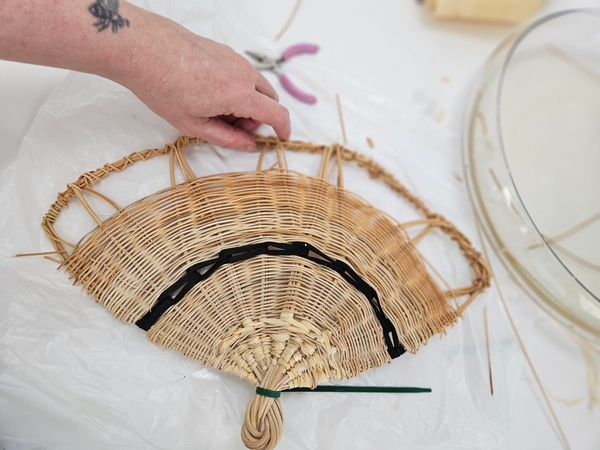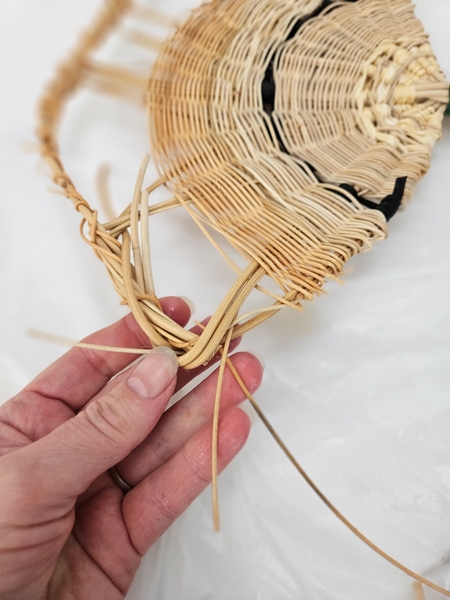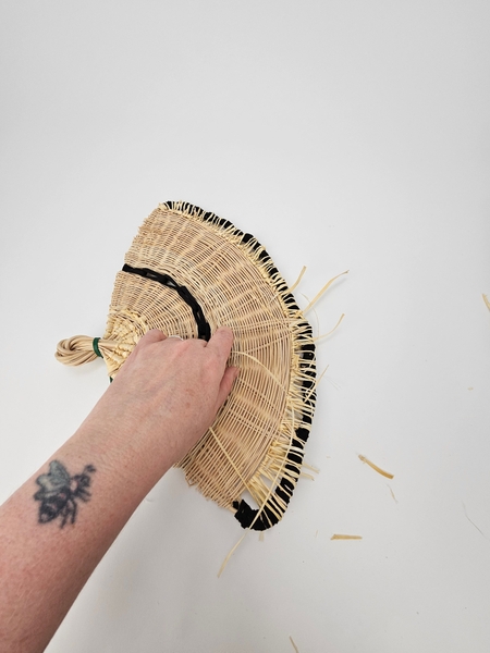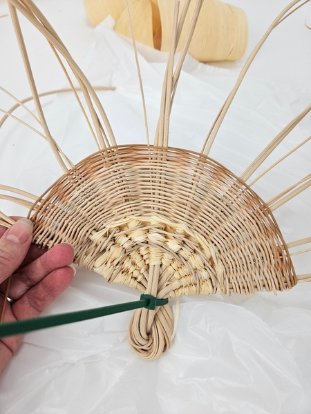 Use soaked rattan and continue the in and out weaving pattern incorporating the new flared open petal shape of the fan.