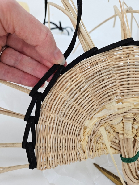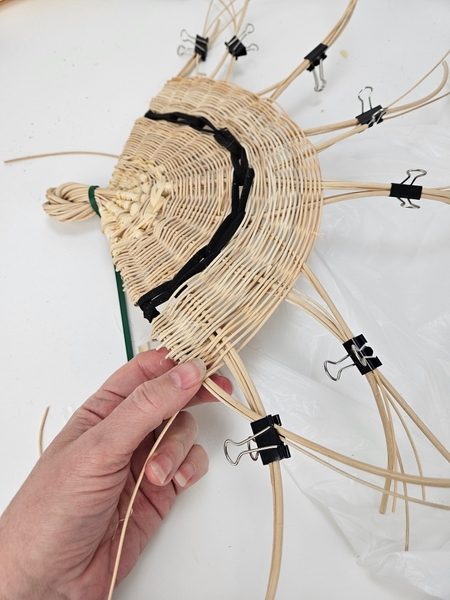Continue with the rattan in and out weaving pattern. Pinch a soaked piece of rattan (three strands in) and start weaving it through the fan shape to the one end and then from one end to the other.