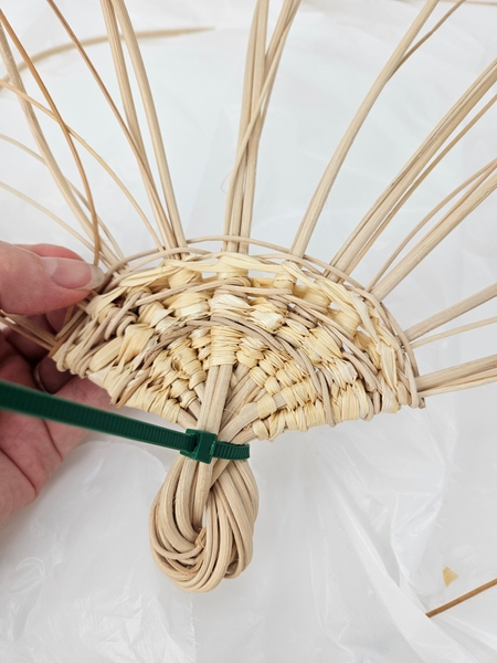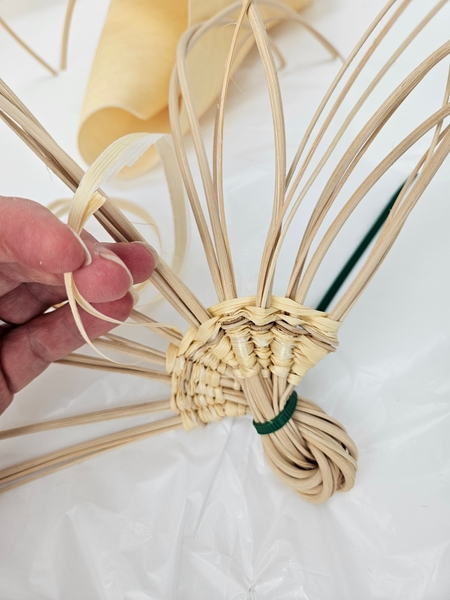 It is easier to weave with the fibers when you establish the fanned out shape. When you have a beautiful fanned out shape start weaving with the rattan to complete the fan.