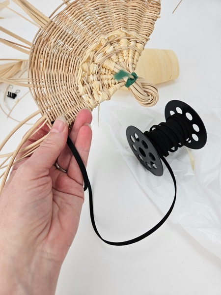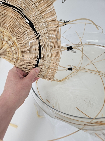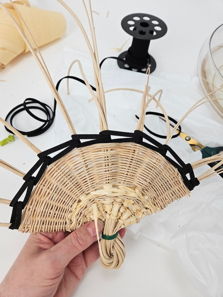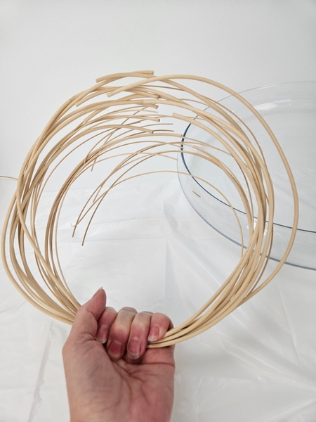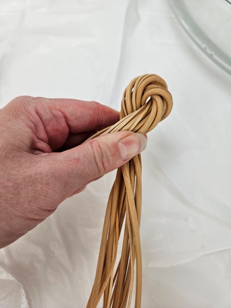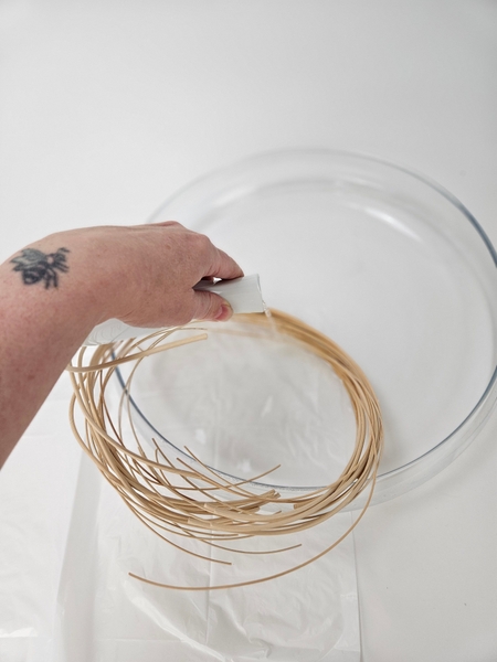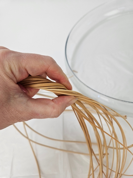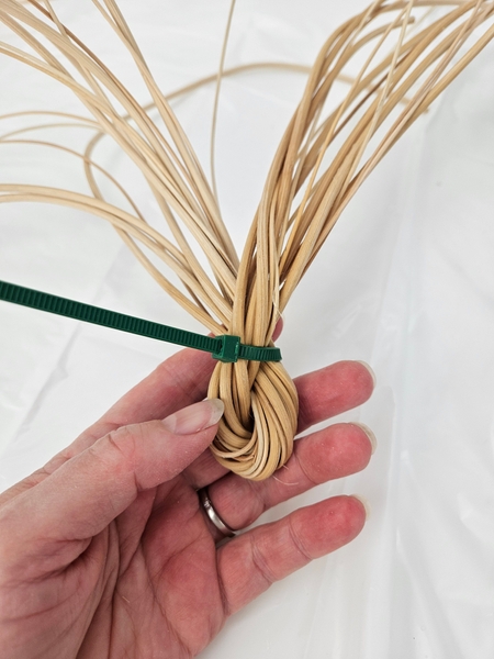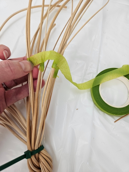 Design tip: use florist tape (or clips, scroll down, if you prefer a no waste option, I show you that option a bit later when we need something stronger than tape) to temporarily separate the rattan into bundles if you find you get confused with what goes where. But it is not really necessary. Once you start weaving the first row the rattan is bundled into position.