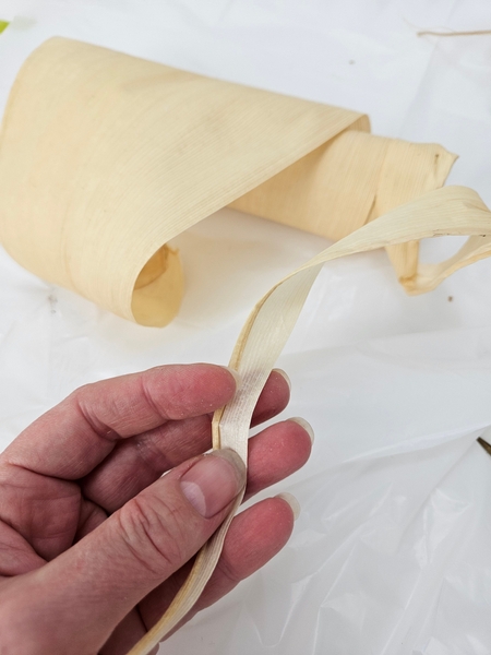 And start wrapping the angled rattan with one of the soaked strands from the bundle...