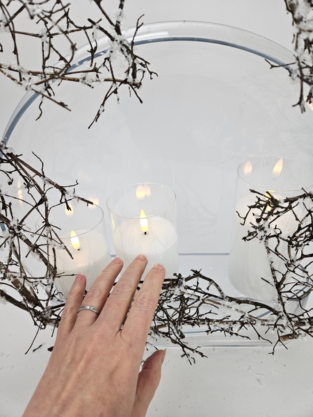 Slip the candles to rest between the two containers. We do this so early on to make sure that you can always reach in to switch the candles on and off in the display without ruining the design.